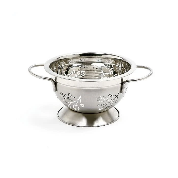 Has decorative cut-outs of strawberries on the “bowl” of the colander.