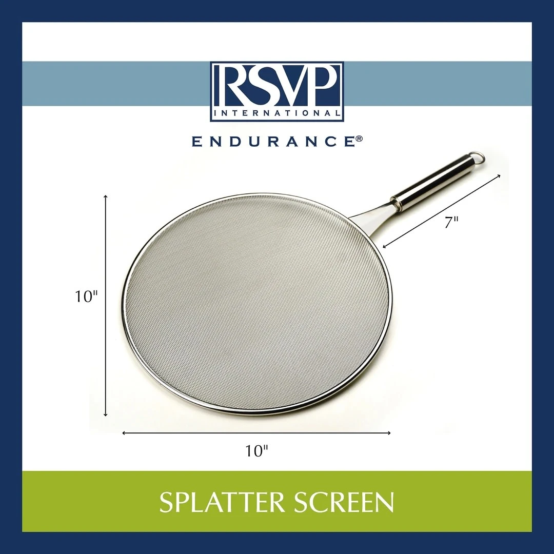 - Our Endurance Double Fine-Mesh Splatter Screen is large at 10-inches in diameter, with a handle that is 6.25-inches long to allow the splatter screen to sit perfectly on fry pans, cast-iron fry pans, stock pots, Woks and non-stick skillets. Comfortable long handle keeps hands safely away from heat and hot oil, protecting your skin and safeguarding your clothing from stains and messy grease. Handle stays cool alleviating the need for special potholders or mitts.