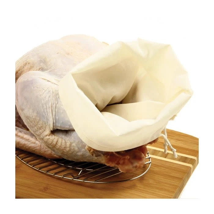This Norpro Reusable Turkey Stuffing Bag Measures: 10″ x 17″ / .25.5cm x 43cm. You can flavor your stuffing with the natural juices from the turkey when using this bag. This bag is amazing, it allows you to remove your stuffing easily and quickly! No more handling of hot turkey while trying to remove every delicious morsel of dressing. This bag is made of 35% cotton / 65% polyester material. Hand washable, air dry. Instructions: Remove giblets and neck from turkey cavity and rinse cavity with water. When ready to cook turkey, place bag in turkey cavity. Add stuffing. Tighten bag by pulling drawstring. Cook turkey as directed. When done, remove bag, open and place stuffing in dish.