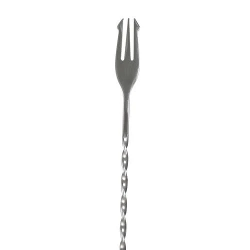 This multifunctional trident bar spoon with garnish pick is a hybrid that has tons of use behind your bar. Stir drinks in deep tumblers, layer drinks and cleanly picking up garnishes! The tight coils allow you to spin the spoon easily and results in a colder, more evenly mixed cocktail. The trident on top gives will keep your fruit and garnishes clean and sanitary.