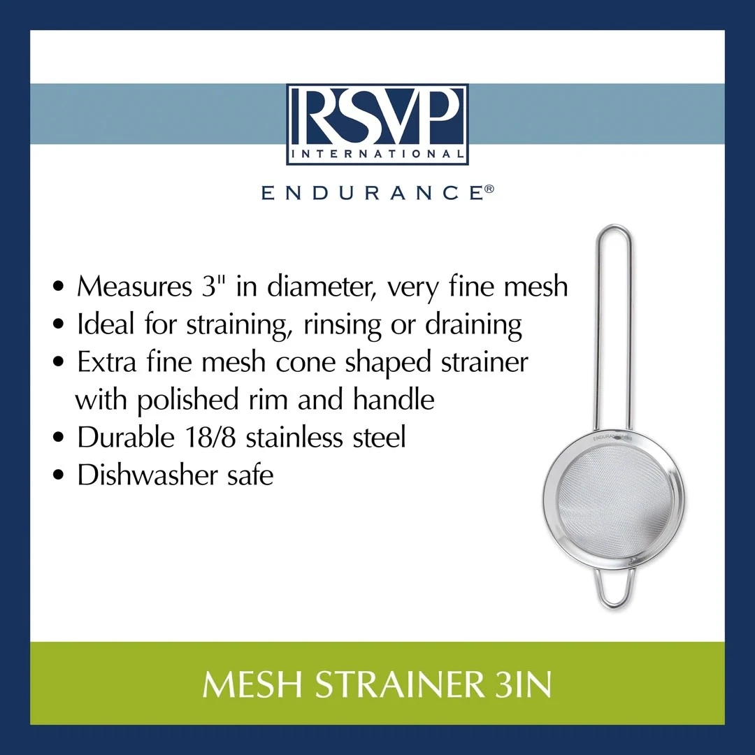 - Extra fine mesh cone shaped strainer with polished rim and handle.