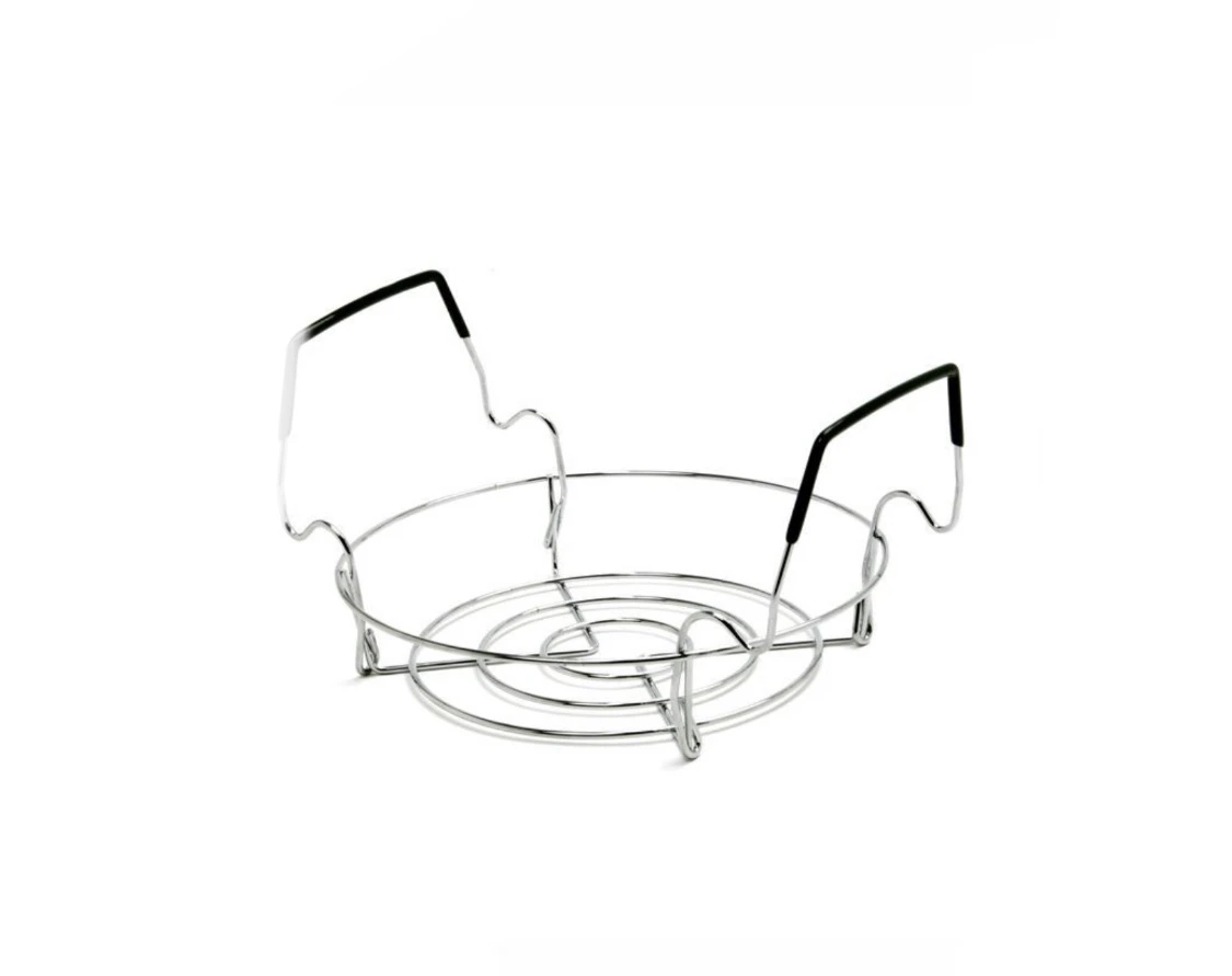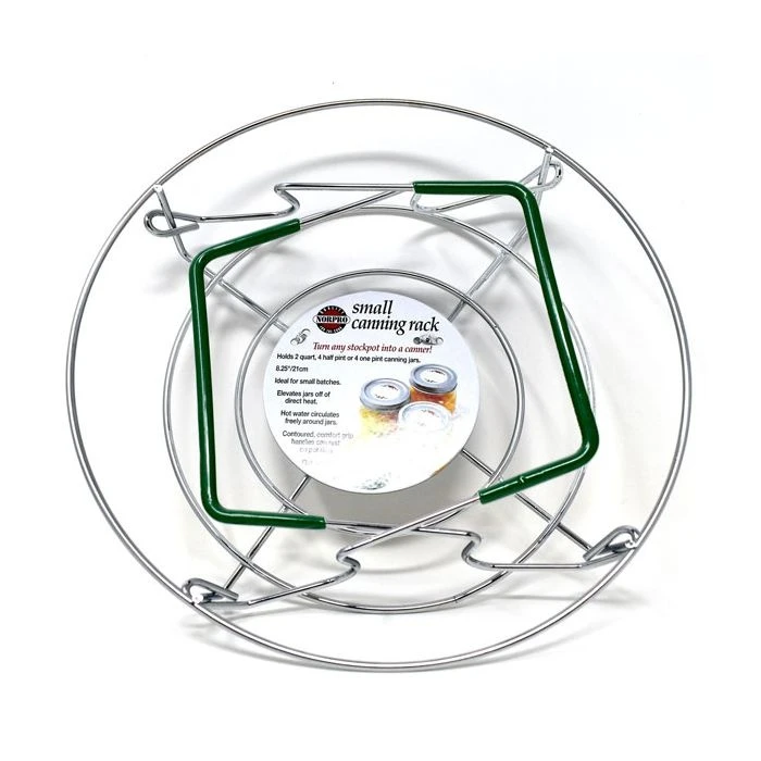 Holds 2 quart, 4 half pint or 4 one pint canning jars. Measures 8.25″/21cm diameter. Turn any stockpot into a canner. Ideal for small batches. Elevates jars off of direct heat. Hot water circulates freely around jars. Contoured, comfort grip handles can rest on pot rims. Flat and stable. Made by Norpro.