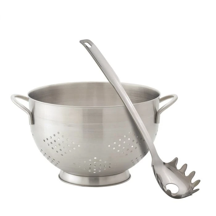 - Pierced stainless bowl tackles heavier tasks; footed base elevates contents above draining liquids, like produce, pasta, grains, vegetables, and more