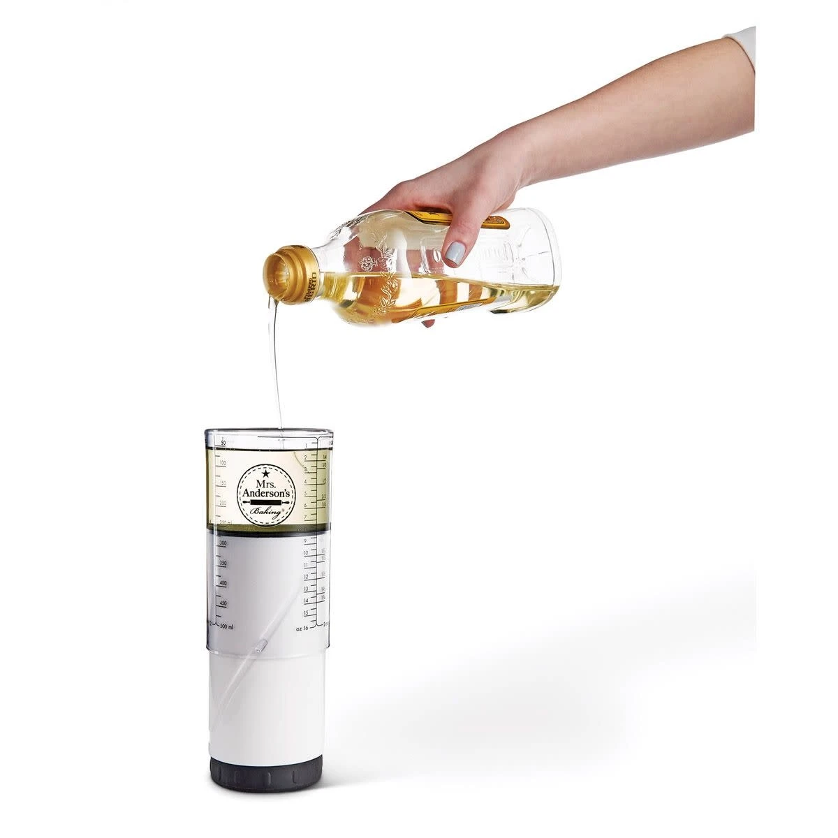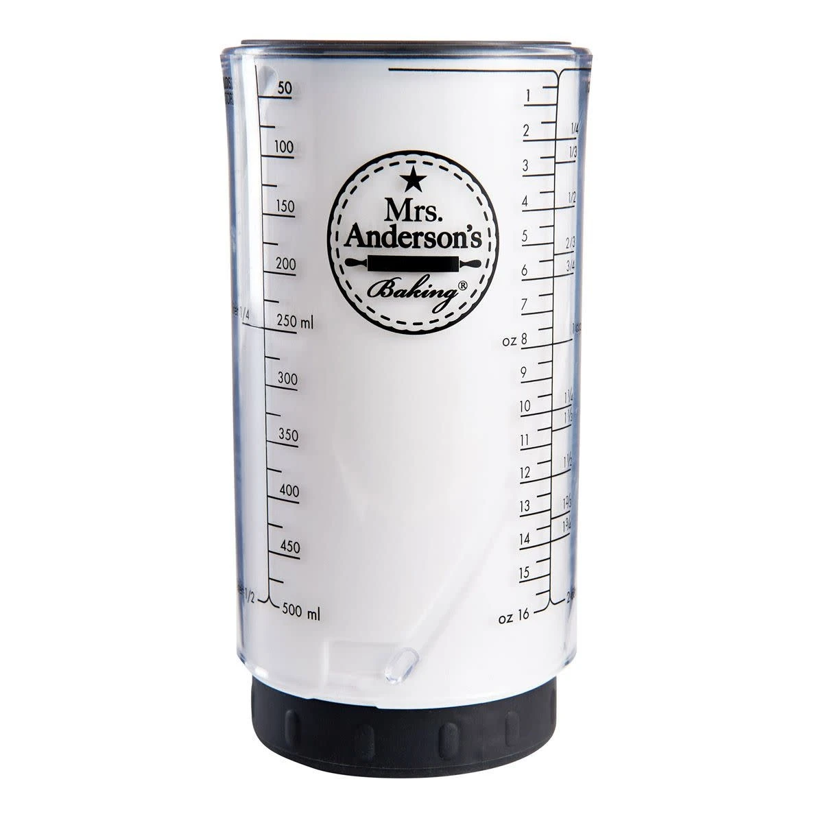 - Measures ounces, cups, milliliters, and liters