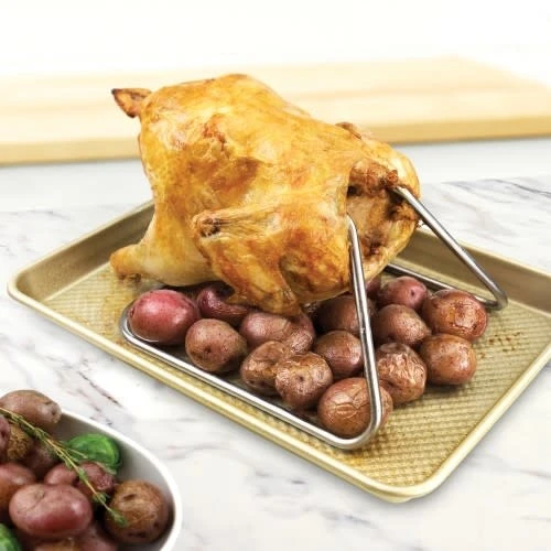 You’ll be salivating over your perfectly cooked rotisserie chicken thanks to our new Chicken Roasting Rack. This roaster keeps the whole chicken from sitting flat on baking sheets ensuring even heat distribution for tender, juicy meat every time! Made of stainless steel to be used safely in conventional ovens and outdoor grills. Whichever method you choose will have everyone asking for more.