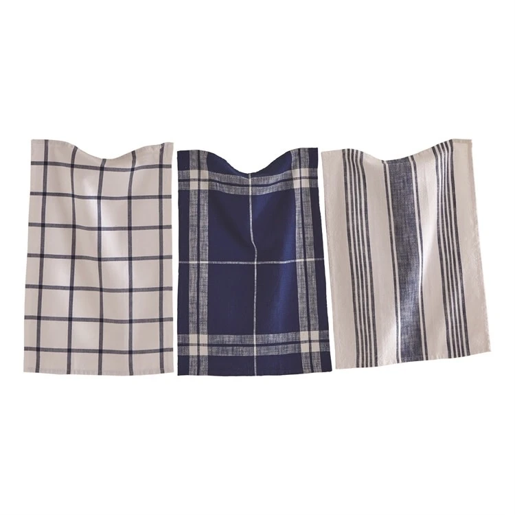 Meet our kitchen mvp and a TAG customer favorite for over 45 years. This dishtowel set includes 1 each of 3 designs in a window pane check, border check, and cafe stripe pattern. Each towel is pre-washed for extra softness and features a woven chambray slub weave.