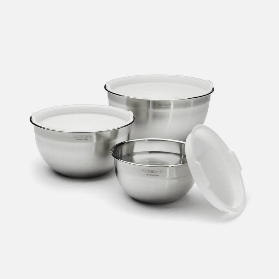 The Cuisinart set of stainless steel mixing bowls come in a set of three with tight-fitting lids for storage. The 1.5 qt, 3 qt, and 5 qt bowls are all refrigerator- and freezer-safe, and dishwasher safe for easy cleanup!