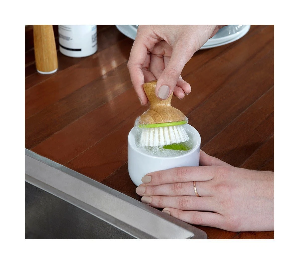 Small but mighty, this sink-side workhorse creates lush suds that make dish time easy (and maybe even a little fun). The ceramic base springs in to action, then stores neatly on your counter to keep the bamboo brush squeaky clean.