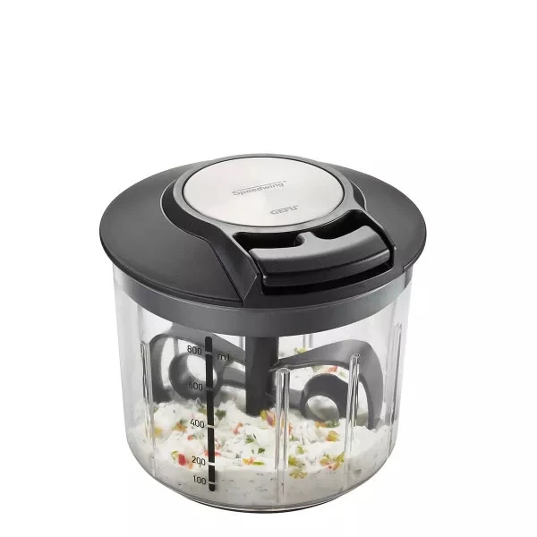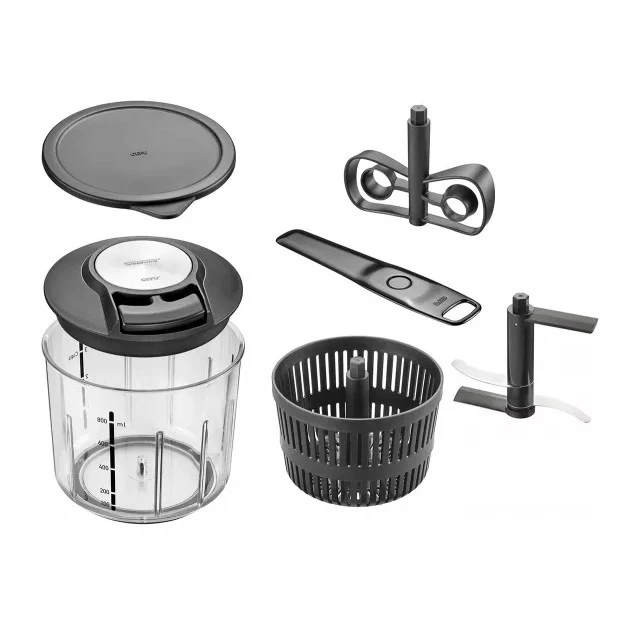 Working entirely without electricity and offering an extremely wide range of uses, this multi-talented product not only chops fruit, vegetables, nuts, onions and fish but can also be used for stirring and mixing dips, conjuring up desserts and spinning herbs dry.