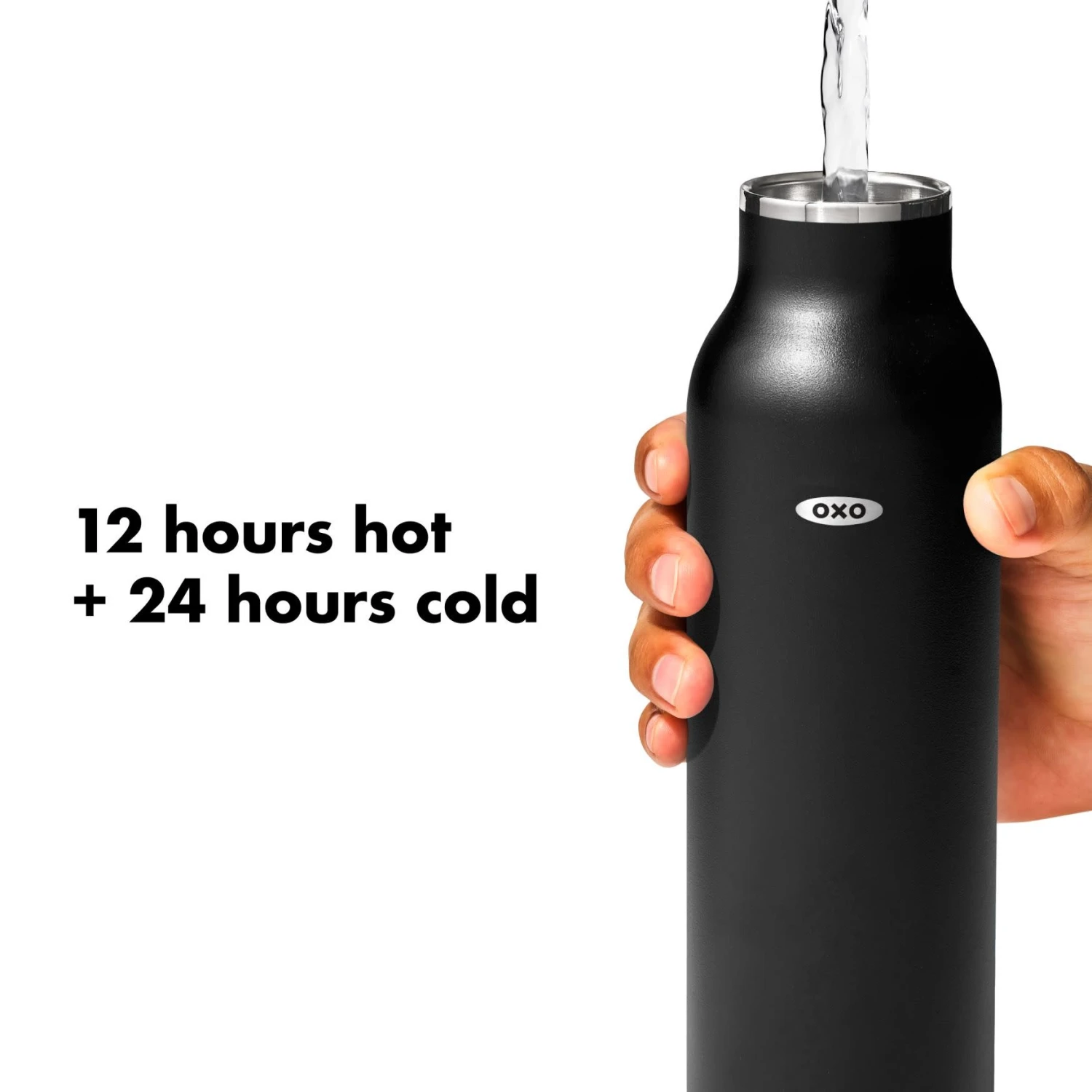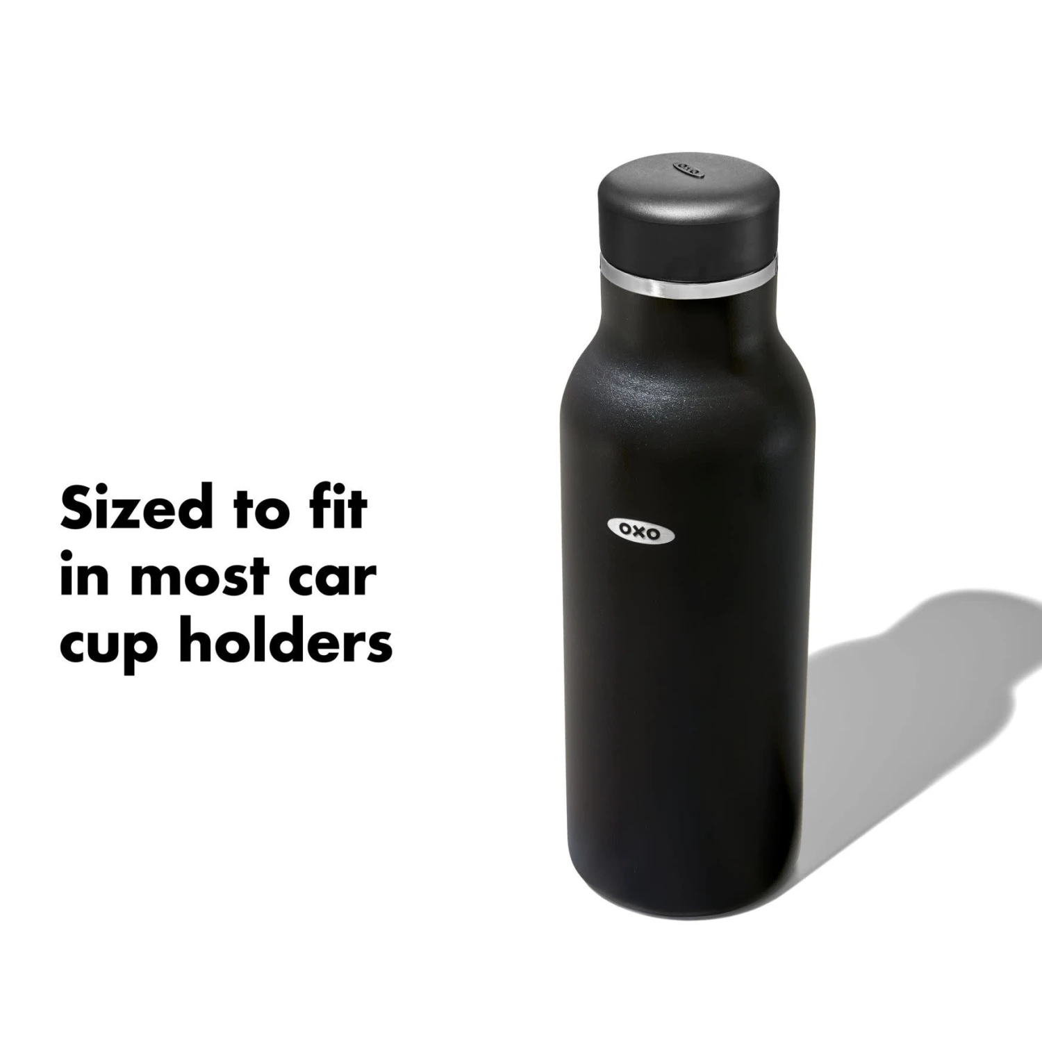 Take your drinks on the go with the OXO Strive Insulated Water Bottle (16 oz/475 mL ). The Insulated Water Bottle is sized to fit most car cup holders and features a non-slip, sweatproof coating for a comfortable grip. The leakproof lid has a silicone seal to prevent spills in bags or on the go. Stainless steel, double-wall vacuum insulation keeps drinks cold for 24 hours or hot for 12 hours.