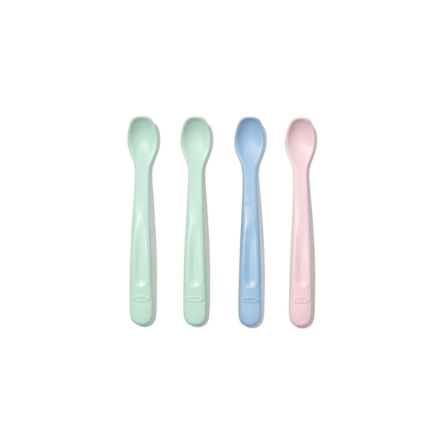 OXO Tot Silicone Spoons are designed to help new eaters self-feed with ease. Made with food-safe, BPA-free silicone, the soft Spoon heads flex for comfort in tiny mouths — no worries about hitting sensitive gums as teething toddlers learn to feed themselves. The Spoon’s deep head holds the perfect amount of food, so dinnertime is more rewarding for hungry tots, while the shallow tip prevents over feeding. The Spoon’s curved, rounded handle is designed to fit perfectly in small hands. When mealtime is over, the dishwasher safe Spoons are easy to clean for next time. Microwave safe.