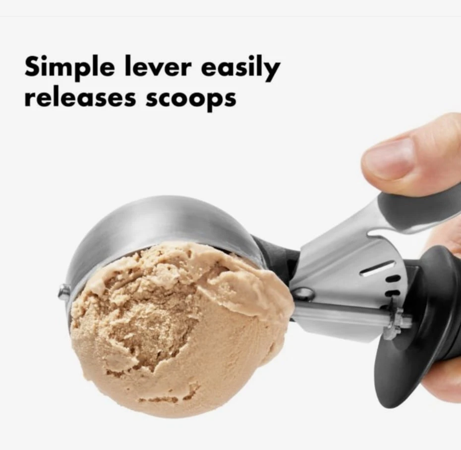 This ice cream scoop makes 2 1/4” diameter scoops at the flick of the thumb. Sturdy, slip-proof handle. Made by Oxo.