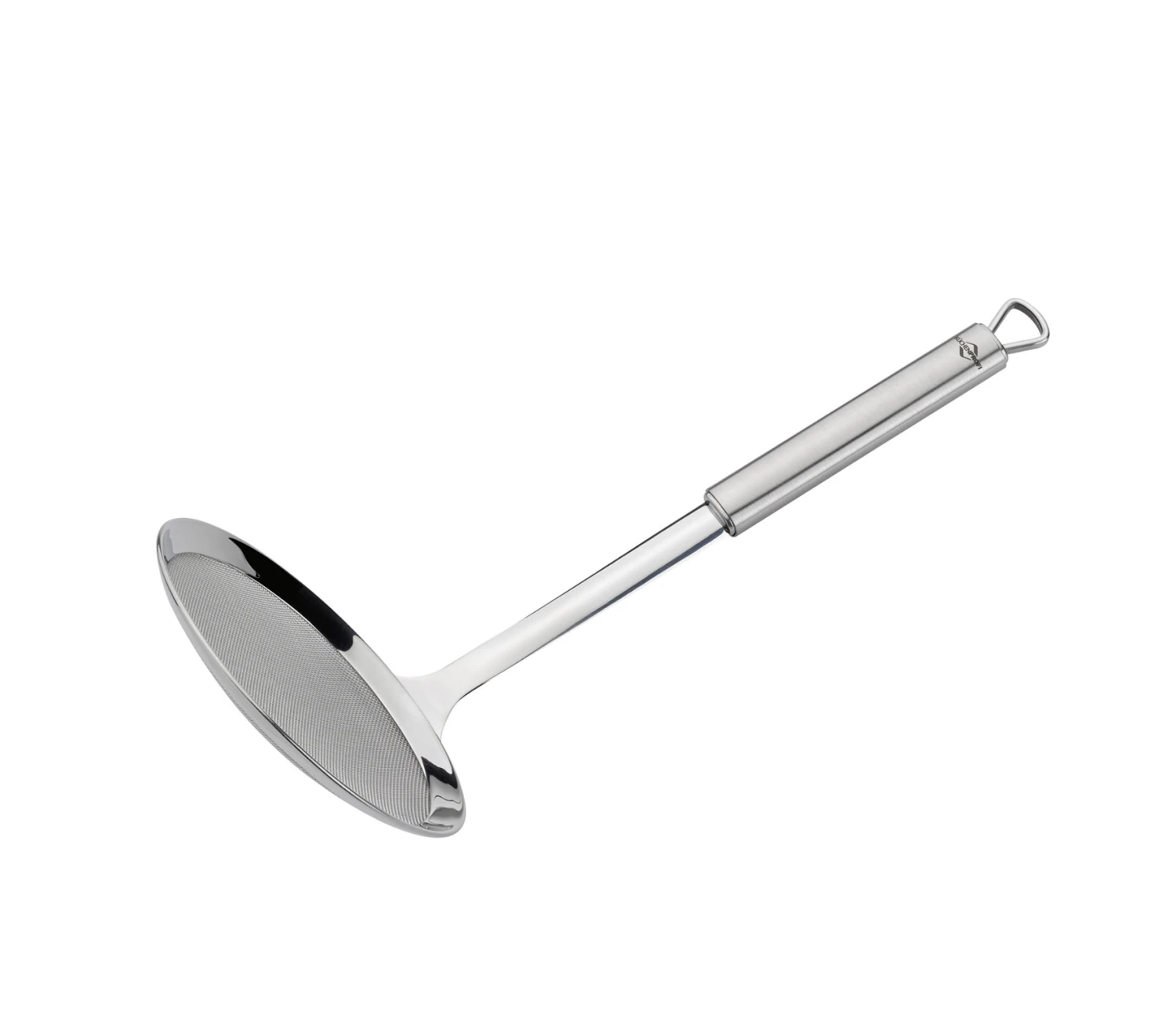 - Parma stainless steel Skimmer with built in filter screen easily skims away fat from soups and sauces