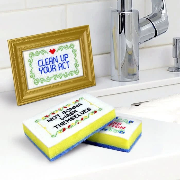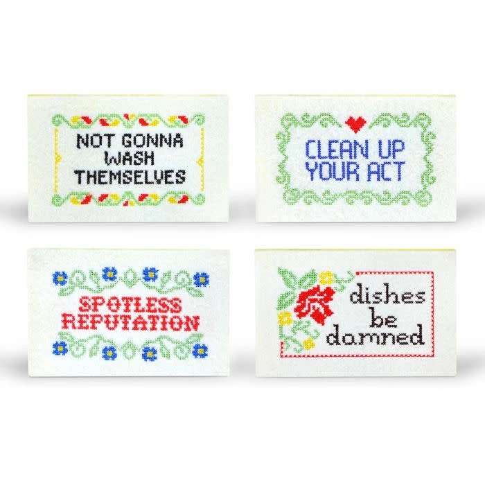 Doing the dishes brings out the surly side in all of us. Show them how you really feel about tedious tasks with Fred’s SUBVERSIVE SPONGES. Each set includes 4 unique embroidered poly sponges with a PP gold frame that stands on your countertop or suctions to your sink or tile. Packed in a peggable color box. Hand wash only. Design by Charlotte Saul from Fred, in cooperation with Subversive Crossstitch.