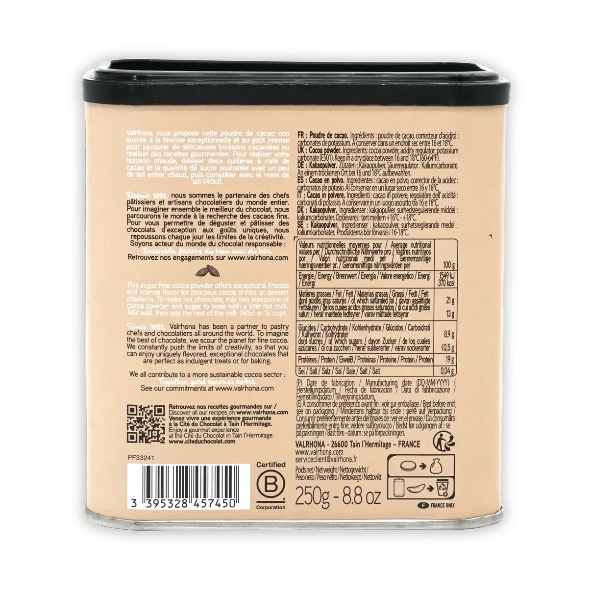 100% pure cocoa powder from Valrhona. Valrhona cocoa powder is pure and intense with a rich red color. This gourmet cocoa powder is one of France’s most famous artisan chocolatiers.Â