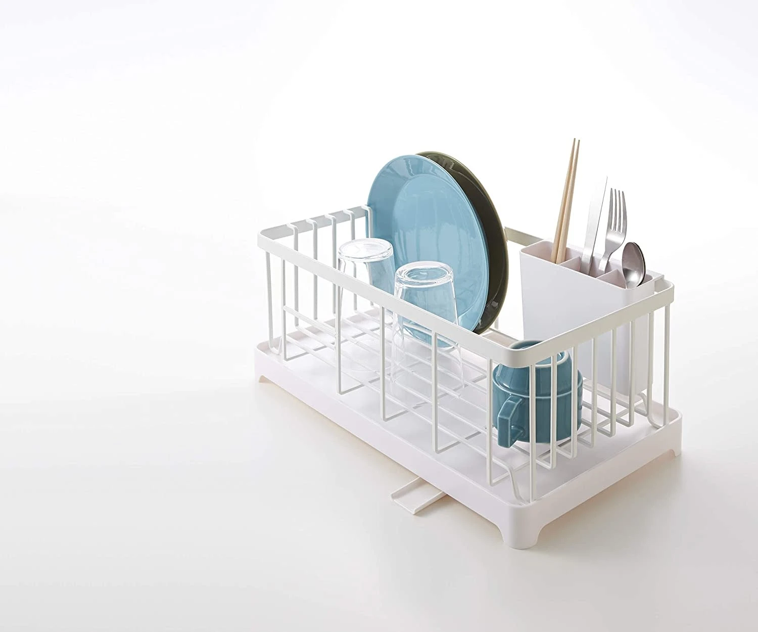 This simple drainer rack will add some style to your dishes. Fits next to any sink and is self draining. A rotating spout on the bottom can be directed towards the sink to return runoff water. The dish rack can hold any variety of plates, bowls, dishes, utensils or glasses that need drying.