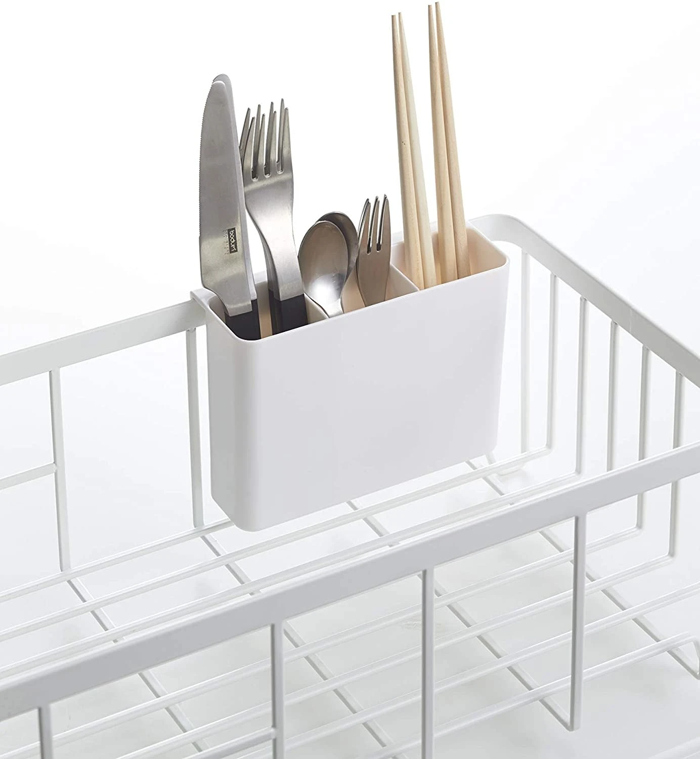 The utensil holder can be hung anywhere along the edge of the rack and is removable for easy cleaning. Both the holder and easy-to-clean base tray are made from plastic while the dish rack itself is steel.
